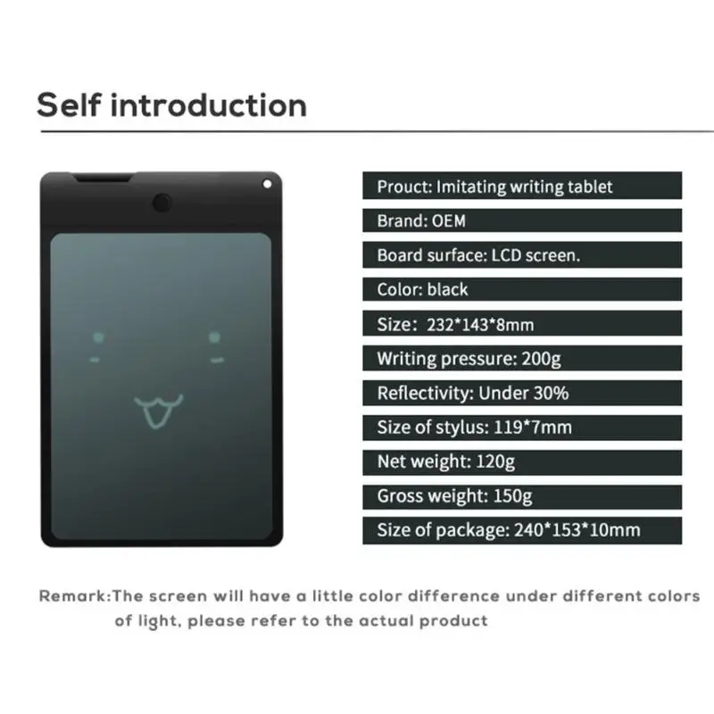 Digital LCD Writing Tablet Electronic Handwriting Pads Notepad Painting Copy Board Drawing Graphic Tablets Specification: Material: LCD Screen color: Black Size: 232*143*8mm/9.13*5.62*0.31'' Writing pressure: 200G Reflectivity: less than 30%. Stylus size: 119*7mm/4.68*0.27'' Net weight: 120g Gross weight: 150g Package size: 240*153*10mm/9.44*6.02*0.39'' Note: Please allow 1-3mm differs due to manual measurement. Due to the different display and different light, the picture may not show the actual color of the item. Thanks for your understanding. 1 x Writing Tablet