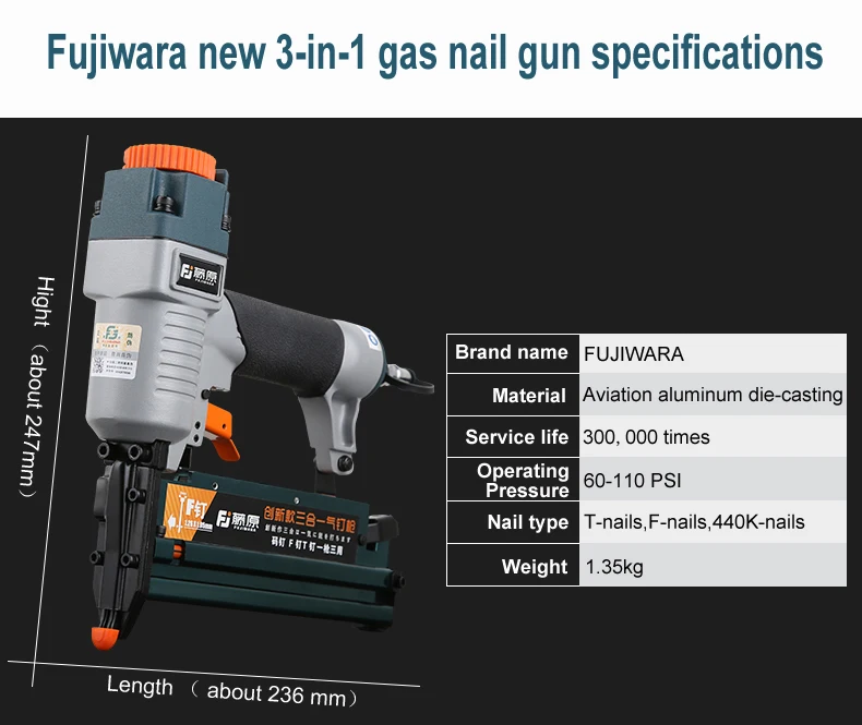 Best Price - FUJIWARA 3-in-1 Carpenter Pneumatic Nail Gun Woodworking Air Stapler F10-F50, T20-T50, 440K Nails Home DIY Carpentry Decoration Very Good